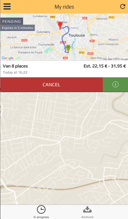 3. After selecting a payment method, the passenger will be directed to the page My Rides› The ride is Pending while waiting for drivers to accept, the expiration delay is shown.