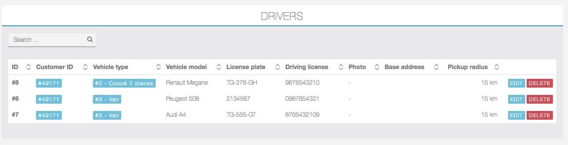 7. Then from CabRide > Drivers, you can manage & delete your drivers