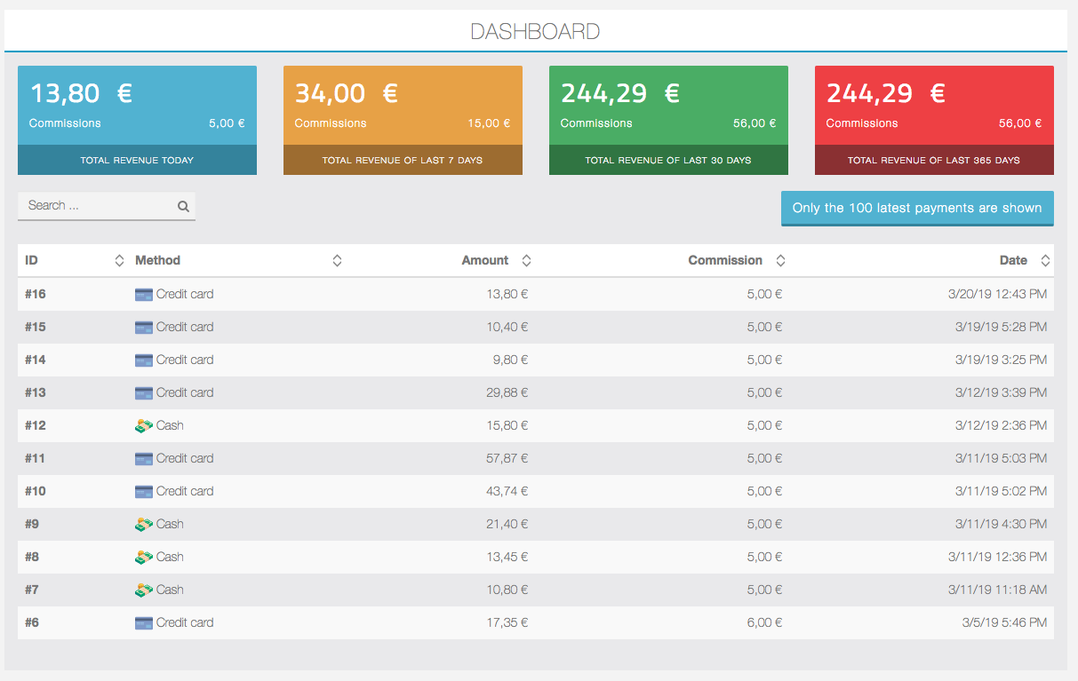 On the dashboard, you have access to a synthetic view of the latest 100 payments, and cumulative boards for daily, weekly, monthly & yearly earnings: