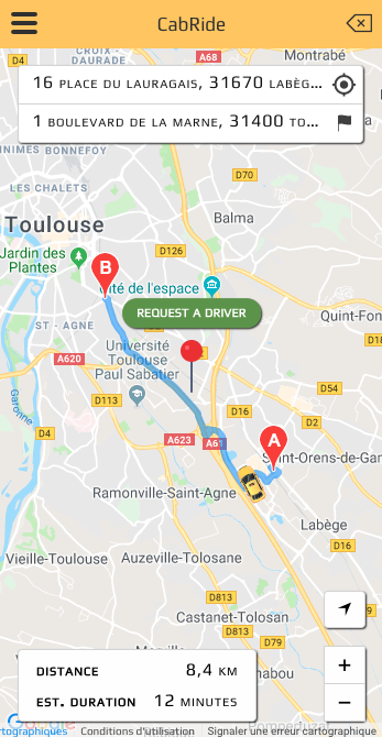 2. The homepage when the passenger defined a pick up address and your drop off address, with estimated distance & duration.› At this step, the passenger can now start a search request for available drivers.