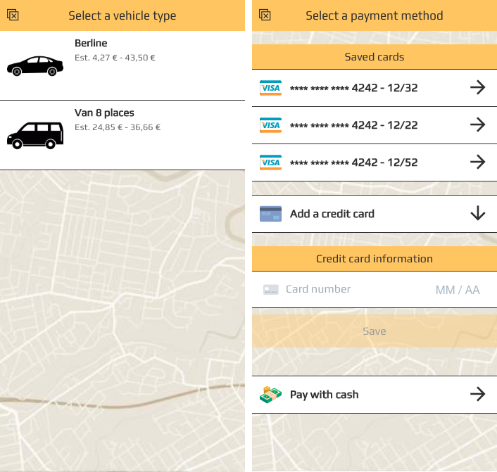 › After the passenger selected a vehicle type, he will have to select a payment method