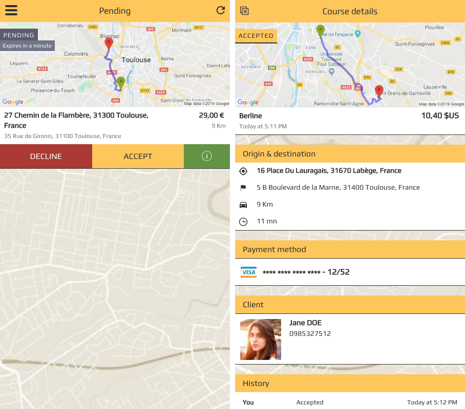 › Drive to client: The driver will inform the client he is on his way, the passenger will be informed of the estimated time of arrival of the driver.